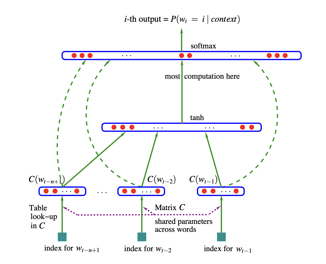 - \(C(i)\) is representated the distributed feature vector associated with each word in the vocabulary.